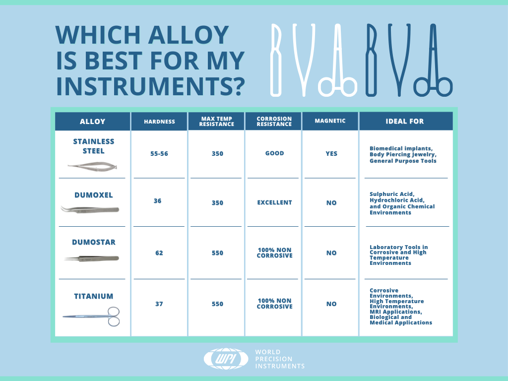 Inox, Titanium, Dumoxel®, Dumastar®, Antimagnetic... Have you ever looked at the variety of metal alloys for surgical instruments and laboratory tools and wondered which is best for your needs? Here's a brief rundown.