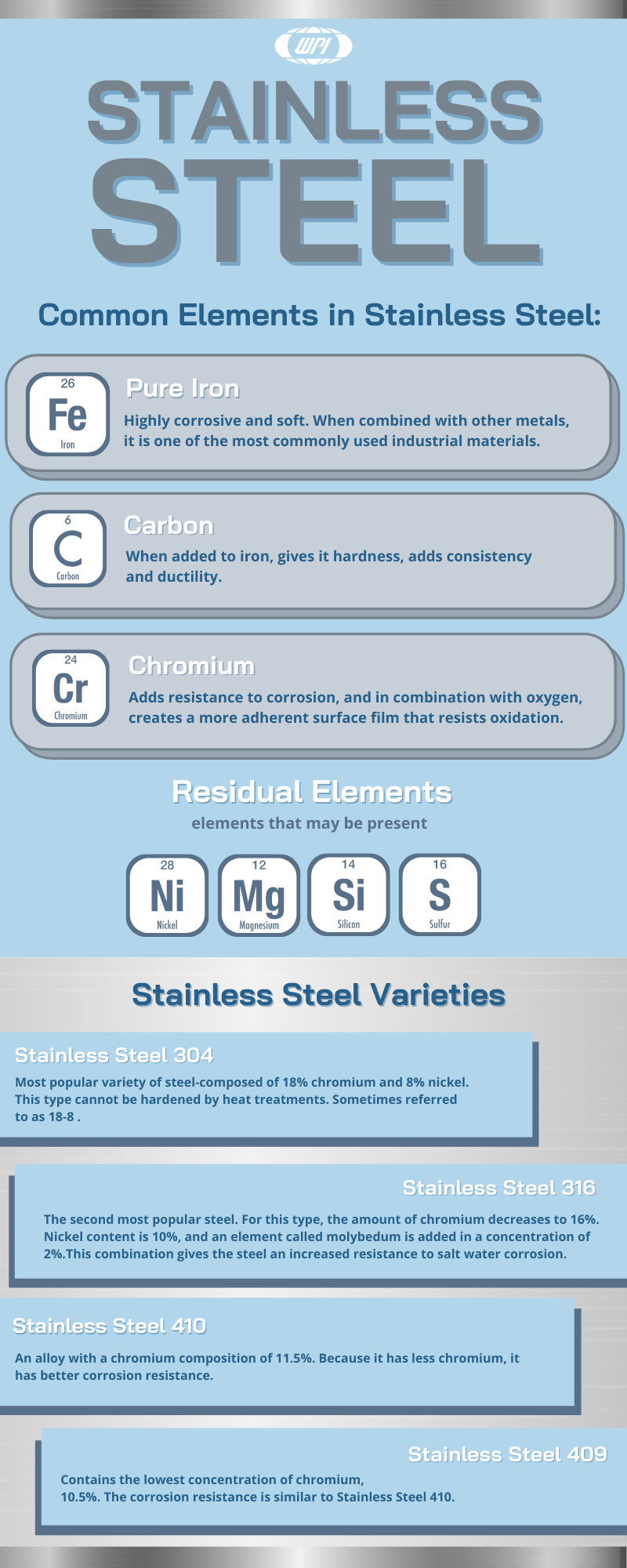 Stainless steel (Inox in Europe) is a mixture of metals, all playing different roles in the final alloy. Common elements found in steel composition includes: